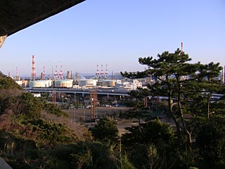 小高くなったところを登ると、展望台から海が見えます。工場と松、新旧のコントラストが見事です。