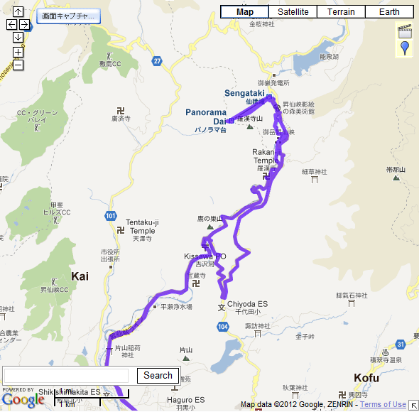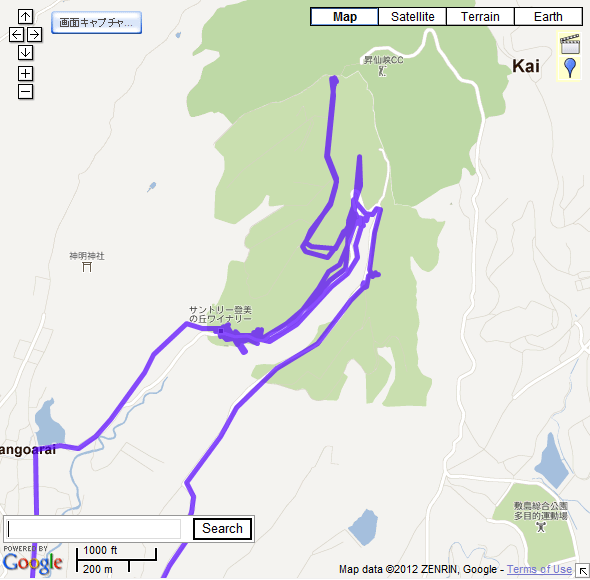 昇仙峡の軌跡。帰りはバスで千代田小を経由したのでかなり離れています。