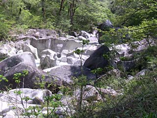 渓谷の水が長時間にわたり、あるいは滝となりあるいは小石を流化して花崗岩を穿(うが)ったもので自然の偉大なる力を表現している。(近くの立て看板)