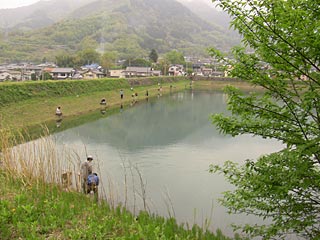 石垣の上は大きな池。釣り堀になっていました。
