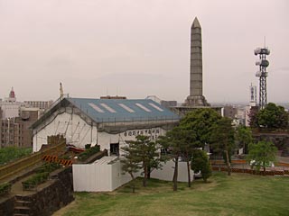 天主台から見た修復中の鉄(くろがね)門。その後ろの石柱は、山梨県内にあった皇室の山林を明治天皇から本県にいただいたことを記念して建てられた謝恩碑。