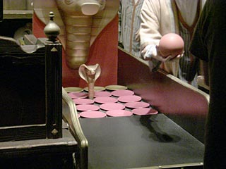 「コブラの罠」というボールゲーム。4球で\500。ゆっくりとボールを転がして、一番奥の金色の皿で止まったら景品がもらえ、外れても非売品のピンがもらえます。