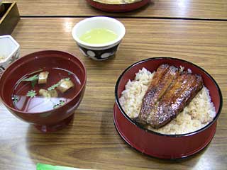 せっかく成田山に来たので、一日遅れで(昨日が土用の丑の日)ウナギを食べることにしました。本当は、正門近くのウナギの専門店「駿河屋」が良かったのですが、ちょうど昼過ぎで混んでいて「30〜40分待ち」と言われたので、呼び込みしていた「旅館若松本店」に入り「うな丼定食」を頂きました。