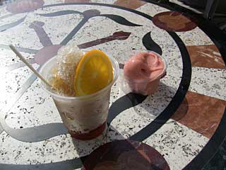 シェイブアイス(レモンティー&ゼリー)とジェラート(オレンジ)。ジェラートは、暑い時はコーンはなくて、カップだけなのだそう。