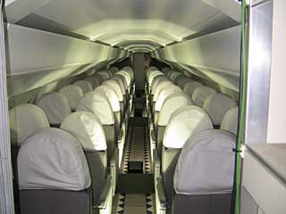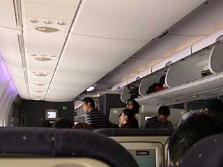 機内。エコノミー席は、広くなった感じはあまりしませんが、フットレストは付いていました。収納棚は余裕があるように思います。