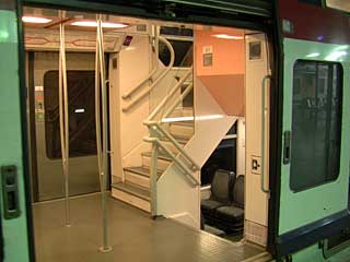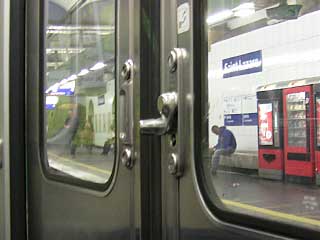 ←地下鉄のドアには(外側内側とも)レバーが付いていて、駅に着いてもレバーを持ち上げないとドアは開きません(閉まる時は自動で閉まる)。電車が完全に止まる前、まだちょっと動いているうちでも、レバーを上げるとドアが開くのですが、地元の人はみんなせっかちで、早目に開けて、止まるのと同時ぐらいに乗り降りしていました。