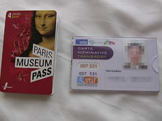 ミュージアムパスは日本で購入。(パリミュージアムパス4日券 ¥5,900、セーヌ川遊覧クルーズ ¥800)。裏に日付と名前を書き入れる欄があり、使用開始日を書き入れて使います(きちんとチェックされる)。ナヴィゴ・デクヴェルトは、Suicaの様なICカードで、タッチするだけで地下鉄やバス、路面電車などに乗れます。今回はZONE1-5の一週間分(月曜日から一週間と決まっている)をチャージ、33.9ユーロ。カード代が別途5ユーロ。写真を貼る必要があり、日本から持って来ています。