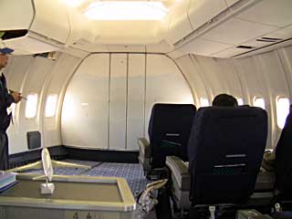 操縦席に座らせてもらいました。インストラクターが説明してくれるのですが、 参加していた人たち(当方の回は全部で8人)の中には、結構飛行機に詳しい人もいて、 地上走行(TAXI)時のハンドルはどれ?とか、ブラックボックス(ボイスレコーダ、フライトレコーダ)は1Fの床下にあるのか? とか、聞いていました(ブラックボックスは事故の時に壊れにくい機体後部にある)。