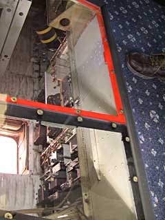1Fの天井がはがしてあり、2Fの操縦席から、エルロン・エレベーター・ラダーなどの操縦ケーブルが、 何本も機体後部に向かって這っているのが見えます。「これだけ大きな飛行機を人力で操縦するのは無理だろう」と思いましたが、 ケーブルで(例えば)方向舵まで行って、そこで(パワーステアリングのように)油圧でブーストされるのだそう。