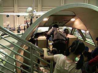館内1Fの「ジャッジェットの操縦にチャレンジしよう!」。手前の操縦席で操縦かんなどを動かすと、その先にある、実物の1/8の大きさの大型模型が 操縦に応じて動きます。飛行機の操縦では、どこをどう動かすのか?を理解してもらうための展示なのですが、(車輪、スポイラー、スピードブレーキ、リバーススラスト(逆噴射)なども動く)、 小さな子どもにはちょっと難しいようです。
