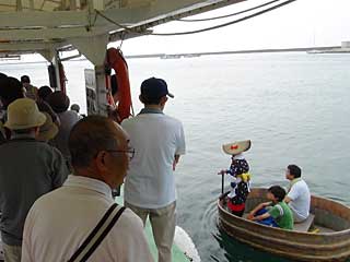 たらい舟には、漕ぎ手の他に3人まで乗れます。簡単に漕げそうに見えましたが、実際にやってみると難しかった。