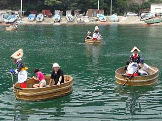 たらい舟は、普通の舟で入れないような狭い所で海の幸を取るのが本来の目的で、この辺りの村では、昔、たらい舟を乗りこなせるのがお嫁入りの条件だったとのこと。