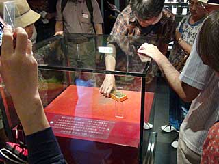 金の延べ棒を取り出してみませんか?のコーナー。穴が微妙に小さくて、金が重いので(12.5kg)、なかなか取り出せませんが、コツをつかめば取り出せるそう。取り出しても延べ棒はもらえませんが、記念品がもらえるらしい。