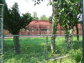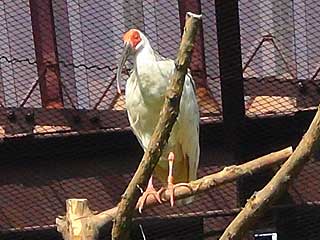 トキ資料展示館の回廊から、20m先にある「佐渡トキ保護センター」で飼育されているトキが見えます。