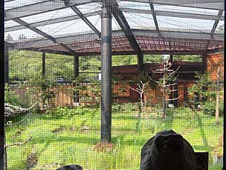 「トキふれあいプラザ」内部。見学者側が暗くなっていて、トキにストレスがかからない構造らしい。