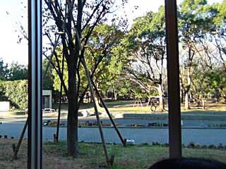 レストランの窓の外は夢の島公園多目的運動広場。