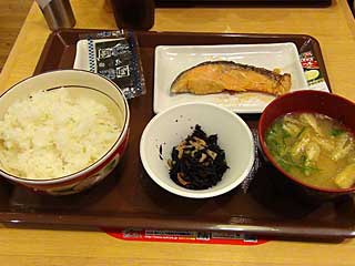 朝食は、ホテルの隣にある、すき家で「鮭定食」\330