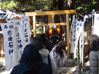 こちらが参道にある小さな社、石神さん。女性の願いをひとつ叶えてくれるということで大人気です。