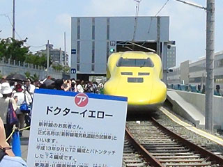 走行しながら電気及び軌道の設備状態を各種の計測機によって検査する「電子軌道総合試験車」、通称ドクターイエロー。平成13年9月にT2編成とバトンタッチしたT4編成だそう。