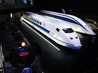 入るとまず迎えてくれるのが、「世界最速を記録した高速鉄道のシンボル」3台。蒸気機関車C62、新幹線試験電車300X、リニア新幹線MLX01。