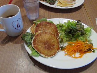 朝食。近くのホテル「ユニゾイン名古屋栄東」1F「Mrs.HEART Cafe」でパンケーキの朝食。ホテルで朝食券を出しているらしく、朝から繁盛していました。