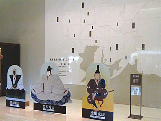 徳川美術館のロビー。織田信長、豊臣秀吉、徳川家康の顔出しパネル。後ろは尾張、美濃、信濃木曾、三河、飛騨、五ヶ国絵図。