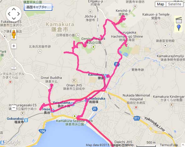 由比ガ浜駐車場→和田塚→鎌倉駅→佐助稲荷神社→銭洗弁財天→けわい坂→亀ケ谷坂切通→建長寺→鶴岡八幡宮→鎌倉駅→鎌倉大仏→長谷寺→和田塚→由比ガ浜駐車場