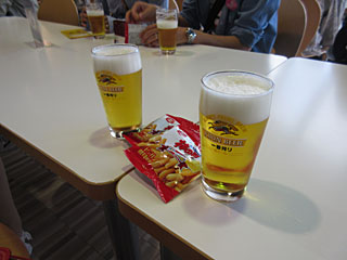 一杯目の試飲は「一番搾り」と決まっています。柿の種チーズ味のおつまみ付き。当方は二杯目は黒ビール「トラウト」にしました。試飲は制限時間20分で三杯までできます。