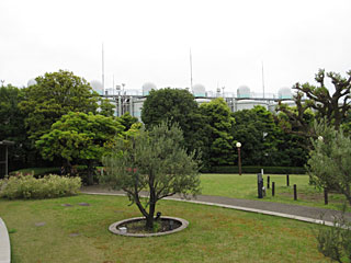 これが実物のコニカルタンク(樹木の後方)。とにかく巨大なタンク。