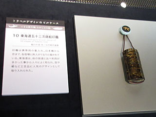 印籠は携帯用の薬入れ。日本橋から京まで、各宿場と旅人がぐるりと描かれている。(説明文、以下略)