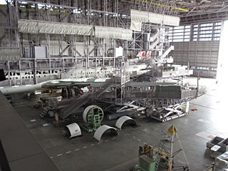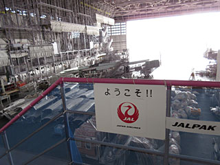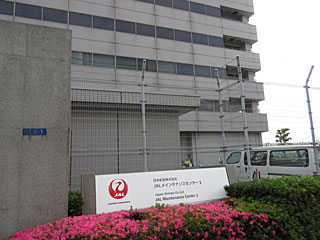 こちらは隣のビル(JALメンテナンスセンター2)の格納庫。渡り廊下でつながっています。こちらはもうちょっと軽微な整備をしていました。A整備でしょうか?