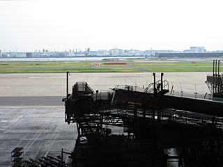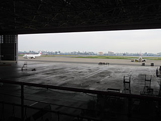 格納庫の大きなドアの先は駐機場で、その先はA滑走路。その先は川崎の工業地帯。
