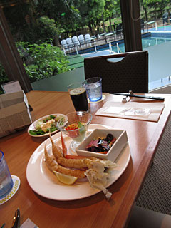 夕食はディナーブッフェ。カニも食べ放題ですが、そんなに食べられません。外は今は使っていない室外プール。