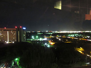 11Fのバー・ペガサスでビールとワイン。成田空港から飛行機が飛び立つのが小さく見えます。B滑走路でしょうか?