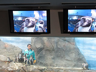 飼育員のお姉さんのおなかにアクションカムが付いていて、観客(我々)がペンギンの後ろに写っています。