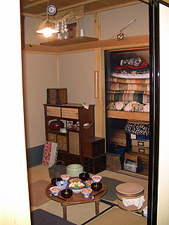 同じく昭和初期、文化住宅の展示。おめでたいことがあった日だそうで、お赤飯です。押し入れに、布団などが入っているように見えますが、写真です。