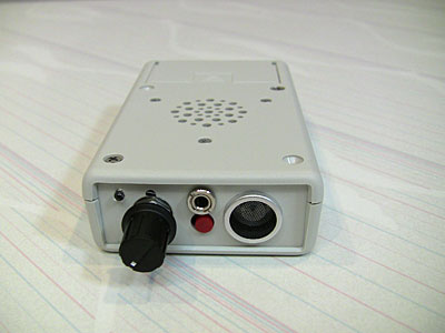 左から、電源LED、ボリウム(電源スイッチ兼用)、イヤホン端子と周波数選択のプッシュスイッチ、超音波センサー。