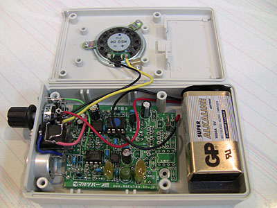 出来上がって、ケースに入れない状態で試運転しました。ボリウムを上げるとサーというノイズが聞こえ、梱包用のプチプチを握る(ねじる)と、その音がボイスチェンジャーのように変換されたので、何かしら一応動作はしているようです。