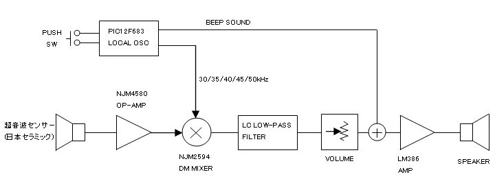 超音波センサーの信号をNJM4580で1,000倍にゲインアップしてNJM2594に加えています。PICマイコン12F683が30、35、40、45、50kHz(default:40kHz)のキャリア(PUSH SWを押すたびにピッと鳴って切り替わる。40kHzではピピピッと3回鳴る)を発生し、NJM2594に加えます。NJM2594はダブルバランスドモジュレータで、キャリアと超音波センサー(中心周波数 40±7kHz)の差の周波数に変換しています。PICマイコンの生成するキャリアは矩形波で、NJM2594の出力にたくさんの高周波ノイズが含まれるので、LCのLOW-PASS FILTERでノイズを低減しています。ボリウムで音量を調整して、PUSH SWを押した時の“ピッ”音を加え、LM386で電力増幅し、スピーカーをドライブしています。