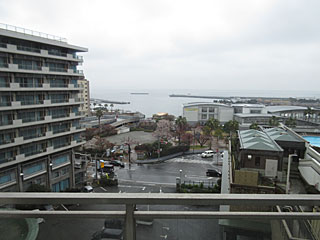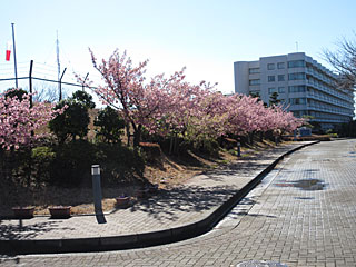 ヘリポートの縁に河津桜が咲いていました。奥の建物は会員制リゾートホテルの「エクシブ」。