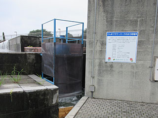 マイクロ水力発電所、落差1.5m、最大0.5kW。レストランの照明やイルミネーションの点灯に使っているとのこと。他に、10kWの太陽光発電所もありました。