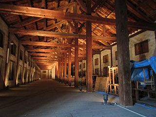 別料金\200で、修理中の国宝「西置繭所」を見学。赤いヘルメットを貸してもらって入ります。