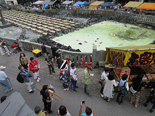 「熱の湯」2Fから見た湯畑。草津のゆるキャラ「ゆもみちゃん」がお好み焼きの店に並んで、買っていました。