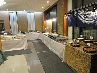 今回のプランは夕朝食のバイキング付き。18:10過ぎに行ったら会場は満席で、別の部屋(左の写真)に持って行って食べて下さい、とのこと。この部屋もあとでほぼ一杯になりました。