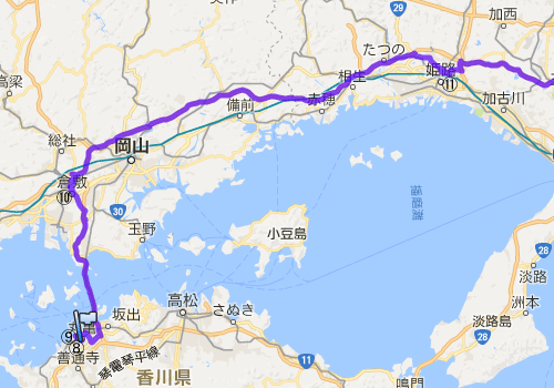 瀬戸大橋を使い、香川県から岡山県に移動します。瀬戸大橋は上を車が、下を電車が通ります。与島パーキングにいる間に、貨物や電車など、3編成見かけました。