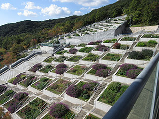 明石海峡公園は、2000年に開催された「淡路花博」の会場だそうで、隣接する「淡路夢舞台」は、兵庫県を含む第三セクターの運営だそうです。淡路夢舞台の、斜面にたくさんの四角い花壇を作った「百段苑」が面白かった。斜面で登るのが大変なので、専用のエレベータも付いていました。