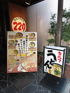 朝食はホテル近くのうどん「セルフうどん やま」。