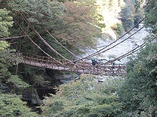 祖谷(いや)の かずら橋。\550で渡ってみました。前にツアーのお客さんがいっぱいいて、渡るのに時間がかかりました。渡り始めると、足元に隙間があって、14m下の水面が見えます。手すりというか横側が、転んだらそのまま落下しそう。前の団体の中年女性がへっぴり腰で、手すりにしがみつくので、こちらも揺れてこわかった。