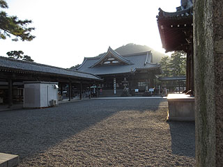 金刀比羅宮は山の上にあり、石段を登ってお参りしてきました。最初は両側に土産物屋があり、365段目の大門からは境内で、595段目までは桜並木、そのあとは割合急な階段になり、628段目の旭社で着いたか?と思うのですが、その後本宮までさらに急な階段を登りました。本宮まで全部で785段。本宮の右手前側は見晴らしが良く、登って来た高さが良く分りました。