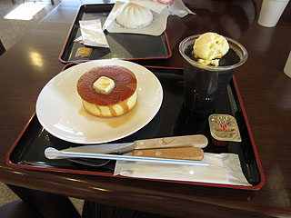 駐車場のデイリーヤマザキで、肉まんとホットケーキの昼食。
